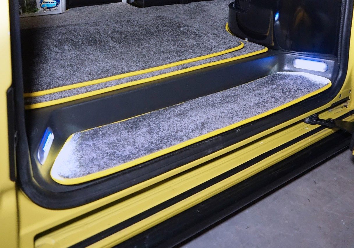 Our tailored camper van floor mats aren’t just for your footwell; we can supply mats for your vehicle’s living areas too! All of our mats are fully tailored to ensure the best possible fit, keeping your interior clean and protected. We have a number of different carpet and rubber qualities available for you to choose from, as well as an extensive range of colour and trim options – so you can really personalise your mats to suit the interior of your vehicle. Take a look at this vehicle, using a yellow trim to match the car’s exterior.